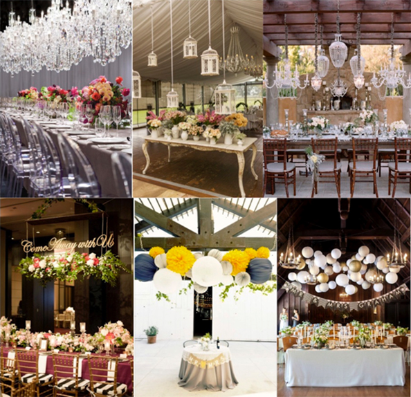 Indien die onthaalsaal se plafon hoog is, maak gebruik van die spasie bo-kant die bruidstafel. Hang ’n waterval van blomme, kristalkandelare van verskillende groottes en style, voëlhokkies met kerse of oosterse lanterns in skakerings van jou troukleure. Dit sal die illusie gee dat die dak laer is en dus sal die saal voller en meer volledig lyk.