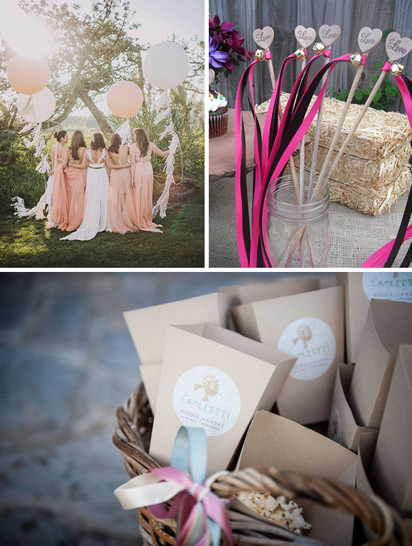 Popfetti is ‘n baie gewilde opsie op die oomblik en is boonop ekonomies ook. (Dit maak sommer daardie hol kolletjie op die maag van die gaste na die seremonie ook vol!) Jy kan jou popfetti in mooi papierhoringkies, boksies of sommer net so in mandjies pak. Die keuses is legio. Dit haal ook heel maklik uit jou hare, sodat jy nie soos ‘n ontploffing in ‘n wolsak op jou foto’s lyk nie.