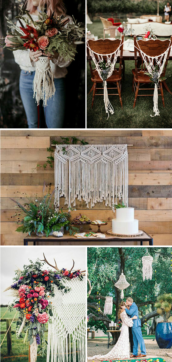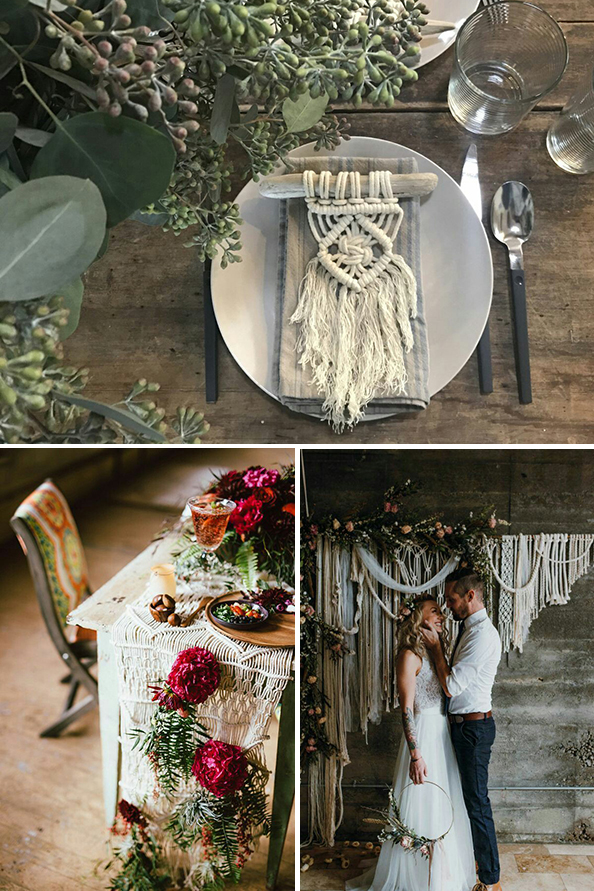 Macramé is die kuns van kreatiewe knoopvorming en ons is verlief op hierdie nuwe tendens. Dit kan op soveel verskeie maniere as dekor by ʼn troue gebruik word. Daar is verskillende knooppatrone wat gevleg kan word om variasie in voorkoms te gee. Dit is die perfekte dekoritems vir die boheemse bruid.