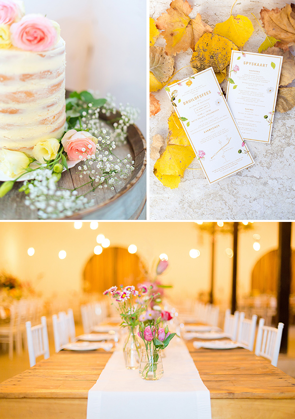 “Omdat ek ’n grafiese ontwerper is, het ek self die uitnodigings, tafelplan en spyskaart ontwerp en laat druk. Glasbotteltjies was deel van ons tafeldekor. Vriende en familie het ons gehelp om dit bymekaar te maak.”