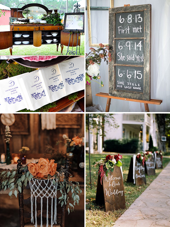 Gebruik antieke meubelstukke om die eetgerei op te dek, of ou deure om julle spyskaart op te skryf. Vra vir jou ouma om ’n mooi lappie te hekel of maak aanwysings uit houtborde. Jou dekor en detail is wat die meeste gaste van ’n troue onthou, asook die kos!