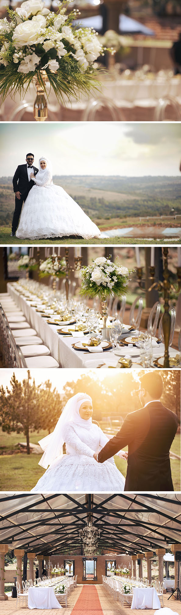 “Die beplanning van die troue het begin met die gastelys en hoeveel mense ons gaan uitnooi. Nadat ons op tagtig mense besluit het, het ons begin soek na die perfekte venue en sommer op die eerste een waarna ons gaan kyk het verlief geraak. Ek het op wit en goud besluit, omdat dit elegant, sjiek en tydloos is en die gevoel van die geleentheid sou komplementeer. Ons het toe voortgegaan met die blomme wat ek en my ouma saam gemaak het en ingepas het by tema van wit en groen.”