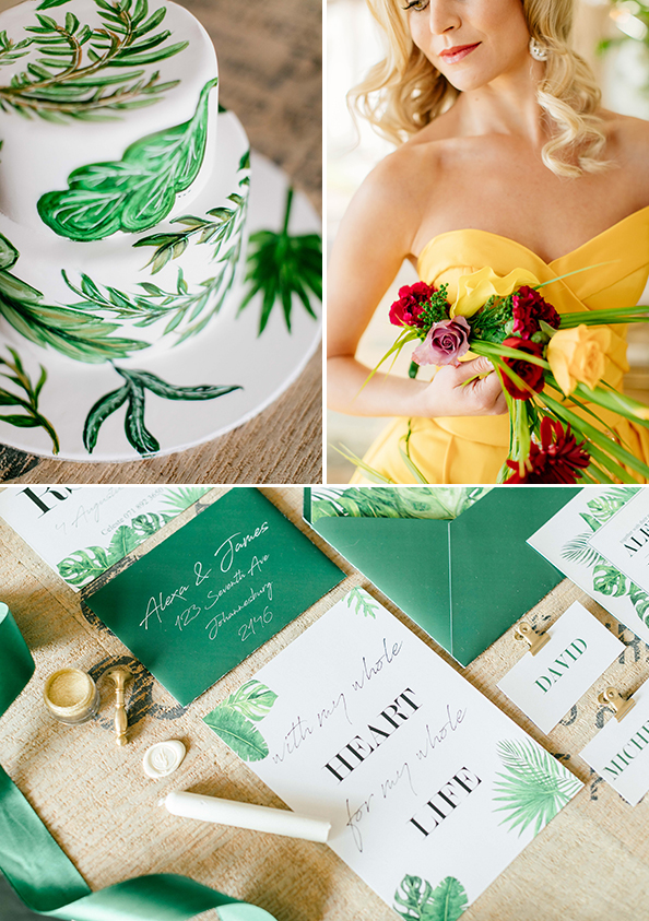 Celeste Dannhauser van Sweetly Cakes het ʼn handgeverfde sitrusgeïnspireerde troukoek gemaak. Dit het perfek gepas by die skryfbehoeftes van The Peachy Peony. Christell du Preez het die gevoel van die dag behoorlik vasgevang met die groen en goue skryfbehoeftes, wat ook mooi sal lyk by ’n troue wat in die somer gehou word. Die jenewerkroeg deur Chef Shaun Bosch het so ’n bietjie glans aan ons viering gegee.”