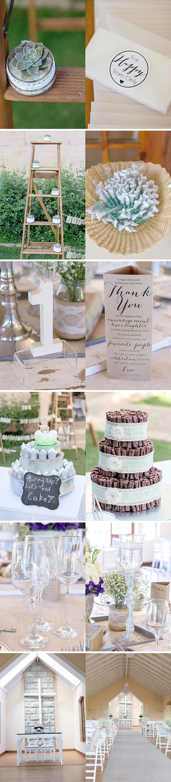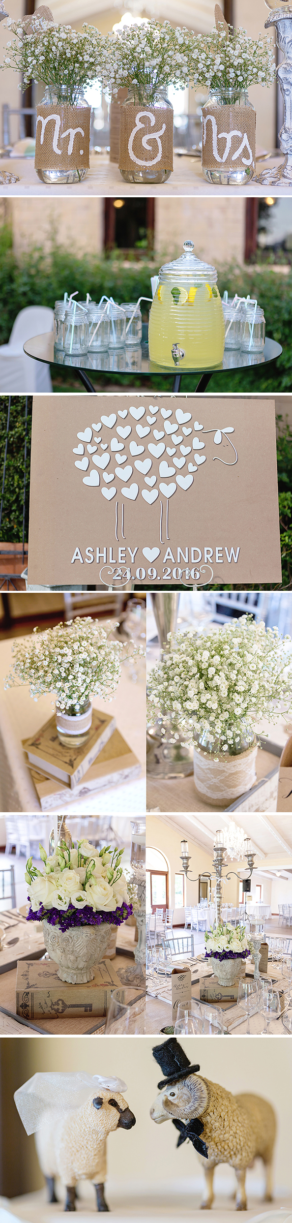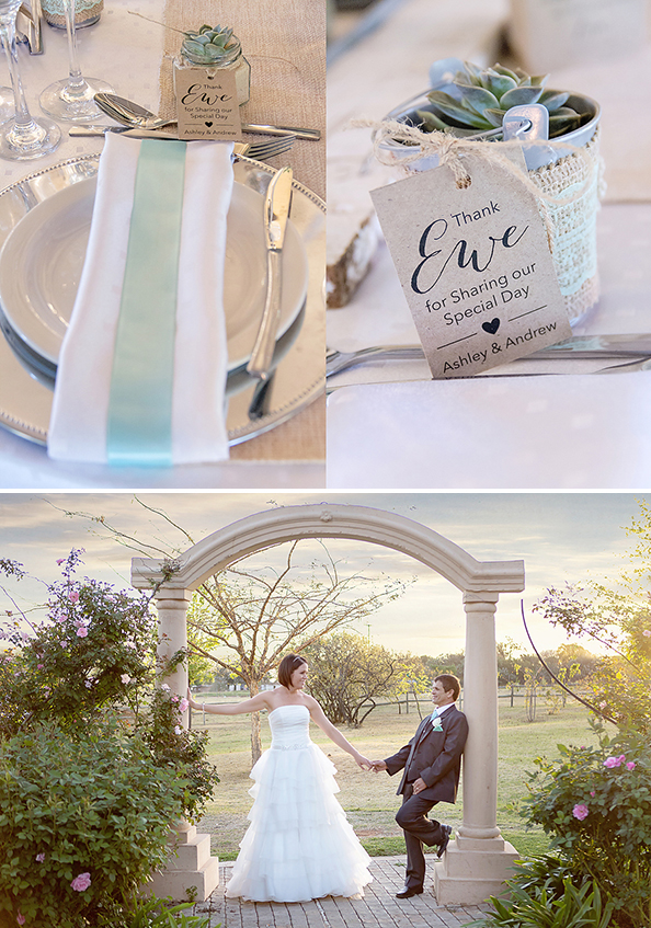 “Ons wou ’n intieme troue hê en het ’n venue begin soek wat aan hierdie behoefte sou voldoen. Ek het Oakfield Farm op die internet raakgeloop en dadelik geweet dat dit perfek sou werk. Die kleurskema was wit en kruisementgroen en, omdat Andrew mal is oor skape, het ons dit oral ingewerk.”