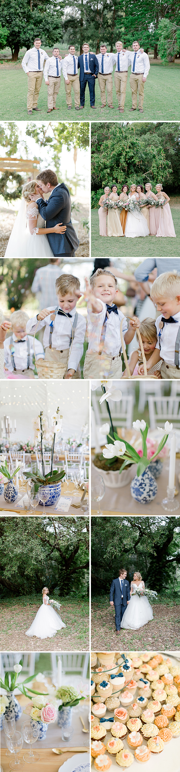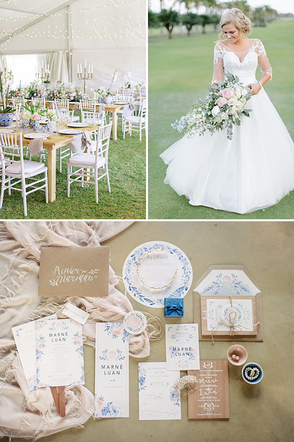 “My gunstelingkleur is blou en dit sou daarom altyd deel van my troukleure gewees het. Ek het opgetel dat vlootblou nogal ’n tendens gaan wees aan die einde van 2016, omdat baie van my bruide dit gebruik het. Ons het toe besluit om blou en wit delftpotte as dekor te gebrui. Omdat blou en wit nogal geneig is om ’n koue gevoel te skep, het ons toe ligpienk en goud ingebring vir warmte. Ons het besluit op sequins as konfetti en dit het pragtig gelyk op die foto’s. Die blomme was skakerings van wit en pienk en ’n mengsel van tulpe, orgideë, peonies, rose en Michaelma-madeliefies. Ons wou spesiale, maar nuttige, dankiegeskenke gee en het besluit op koffiekoppies. Die gaste was mal daaroor en dit het mooi by die dekor gepas.”