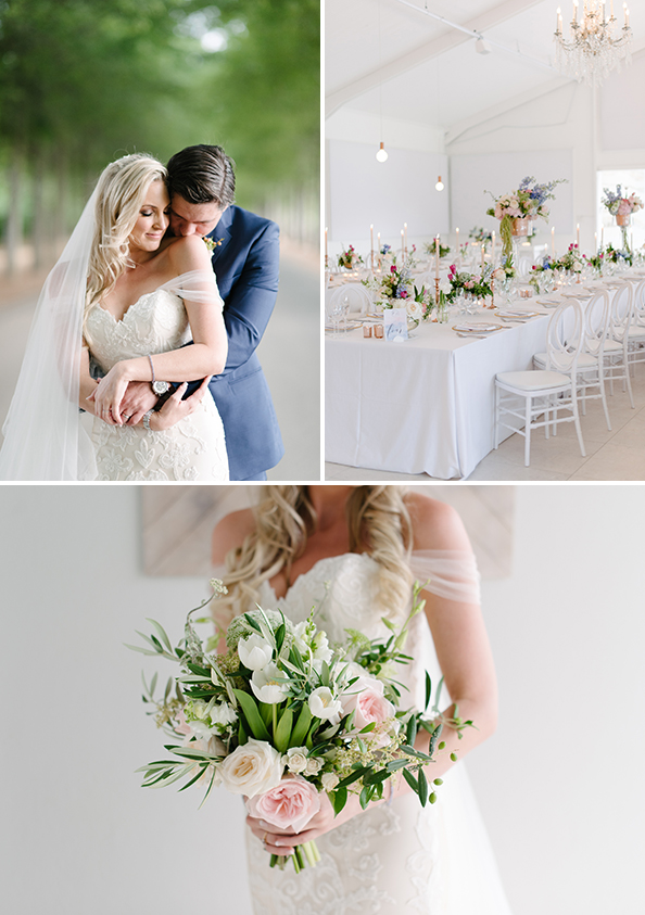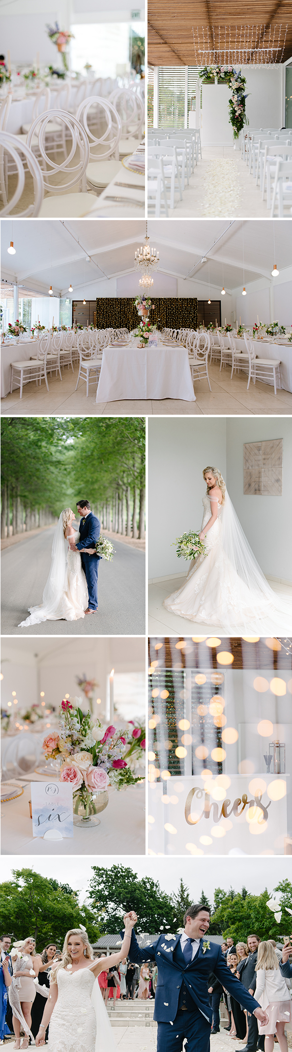 “Ons was nog altyd mal oor ’n mooi wynlandgoed en wou ook ’n plek kies waar gaste kom tuisgaan wat van ver af kom. So die venue was eerste op ons lys. Daarna het ons ’n troubeplanner aangestel en op die detail besluit. Die kleurskema was wit, met skakerings van roosgoud, romantiese blou en pastelpienk. Die atmosfeer was romanties, maar ook prettig, want daar was ook ’n illustreer-kunstenaar wat die gaste vermaak het terwyl ons besig was om foto’s te neem.”