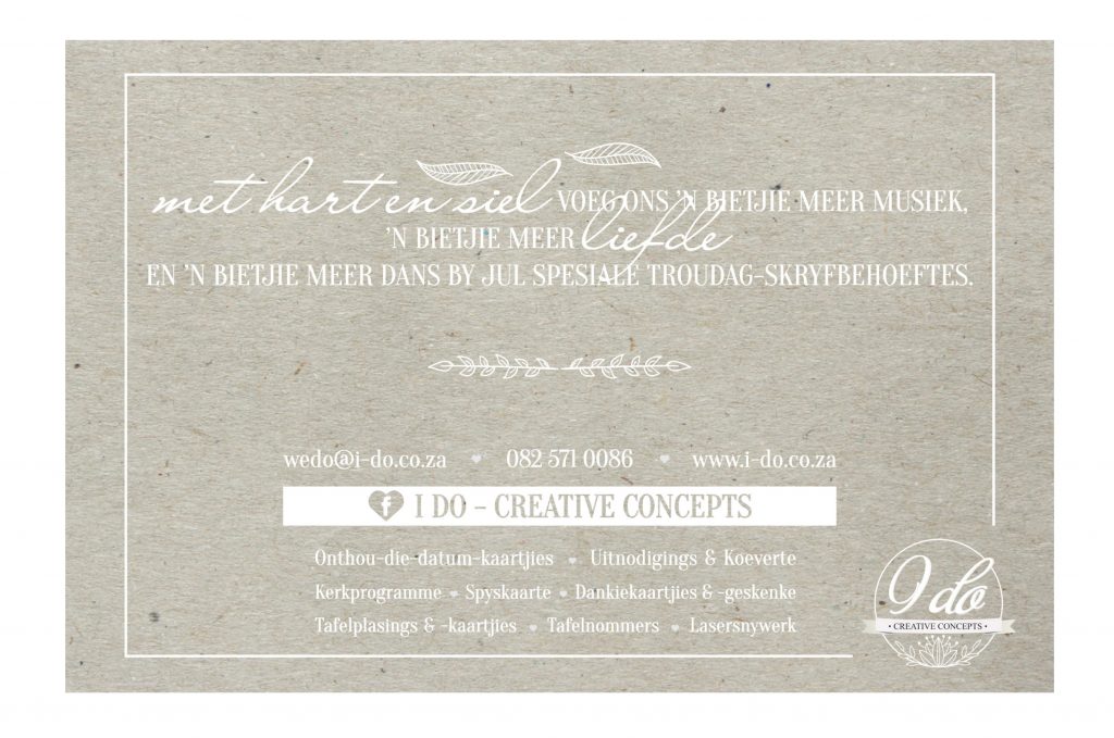 “In terme van die troukoerantjie, is dit maar nogsteeds bietjie meer antiek en rustiek, maar ons beweeg meer na klassieke en elegante ontwerpe. Blomme, waterkleure en geometriese ontwerpe is baie gewild, asook baie minimalisties en skoon ontwerpe.”