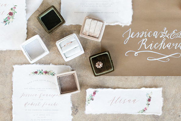 “Verskillende skakerings van groen, pienk en marsala is met grys en goud gekombineer om by die elegante styl te pas.” Die skryfbehoeftes is deur Chrystalace voorsien.
