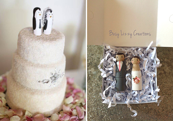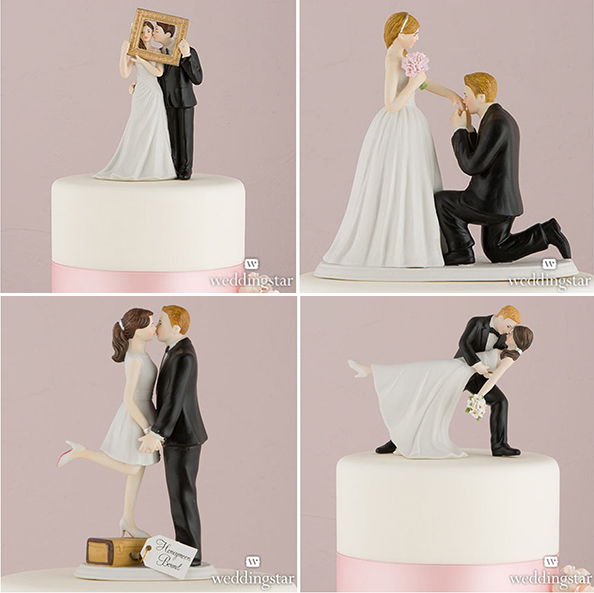 Julle kan hierdie oulike figuurtjies by Wedding Star bestel. Julle kan die paartjie se hulle haarkleur of self velkleur verander (afhangende van hoe lank jy nou in daardie sonbed gelê het). Hierdie cake toppers het baie karakter en is baie ver voor die normale staan-langs-mekaar-figure wat in die verlede gebruik is om koeke mee te versier. Kies een wat julle speelse persoonlikhede die beste komplementeer.