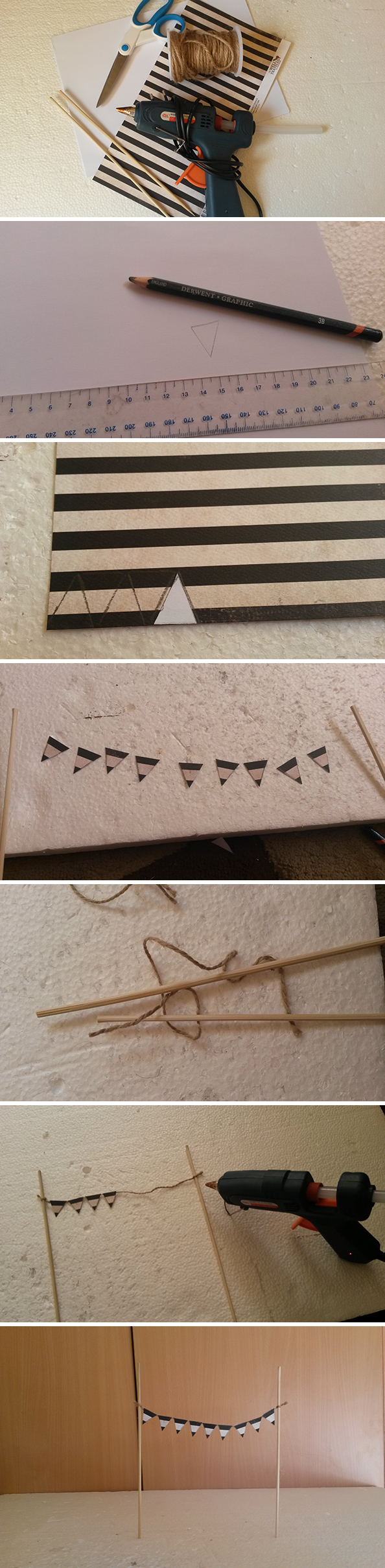 Vat ’n stukkie lint (so lank soos wat jy dit verkies) en bind dit aan die sosatie stokkies vas. Gom jou driehoekies daaraan vas en jou vlaggies is klaar.